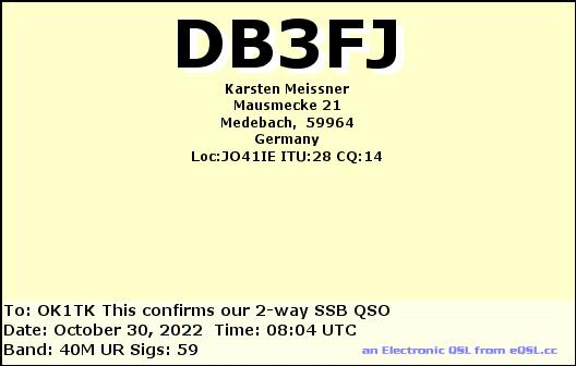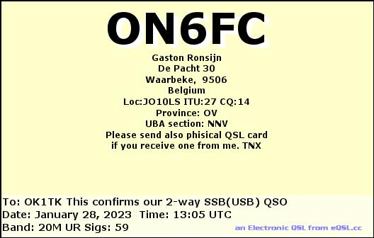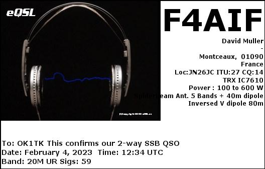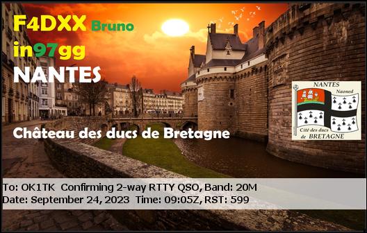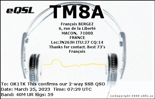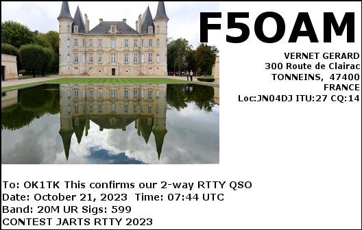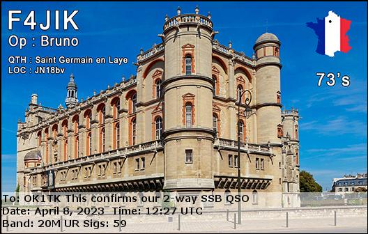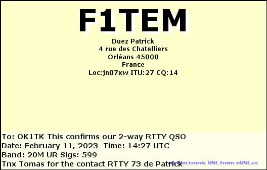 F1TEM, FRANCE /RTTY, 20mF4AIF, FRANCE /SSB, 20mF4AIF, FRANCE /RTTY, 40mF4FDR, FRANCE /RTTY, 20mF4GQP, FRANCE /SSB, 40mF4IYU, FRANCE /SSB, 20mTM6M, FRANCE /SSB, 20mTM8A, FRANCE /SSB, 40mF4DXX, FRANCE /RTTY, 20mF4FDR, FRANCE /RTTY, 20mF4JIK, FRANCE /SSB, 20mF5OAM, FRANCE /RTTY, 20mF6GPT, FRANCE /SSB, 15mF8DVD, FRANCE /SSB, 20mF8KHN, FRANCE /SSB, 20m