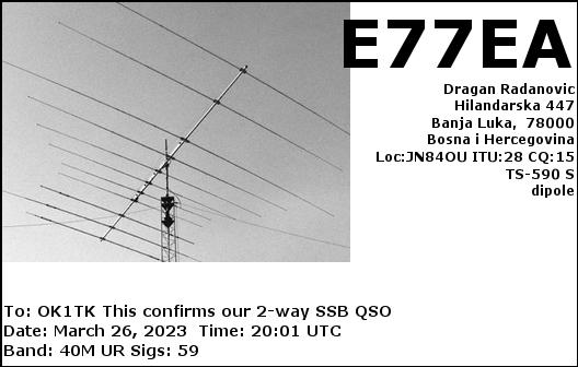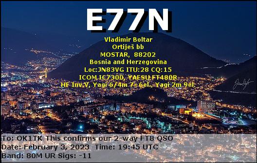 E70Y, BOSNIA AND HERCEGOVINA /RTTY, 40mE77EA, BOSNIA AND HERCEGOVINA /SSB, 40mE77EA, BOSNIA AND HERCEGOVINA /SSB, 40mE77N, BOSNIA AND HERCEGOVINA /FT8, 80mE77EA, BOSNIA AND HERCEGOVINA /RTTY, 40mE79D, BOSNIA AND HERCEGOVINA /RTTY, 80m